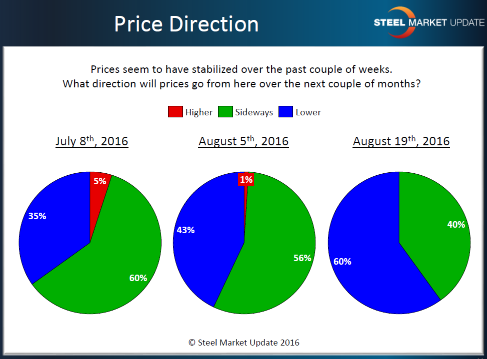 Last week Steel Market Update conducted our mid-August flat rolled steel market trends analysis. For those new to our newsletter, we invite approximately 600 people representing about 550 companies to participate in our bi-monthly questionnaire. Our normal response rate is 100 to 150 people. Last week’s mix was 44 percent service centers, 43 percent manufacturing companies, 5 percent trading companies, 4 percent steel mills and 4 percent toll processors.