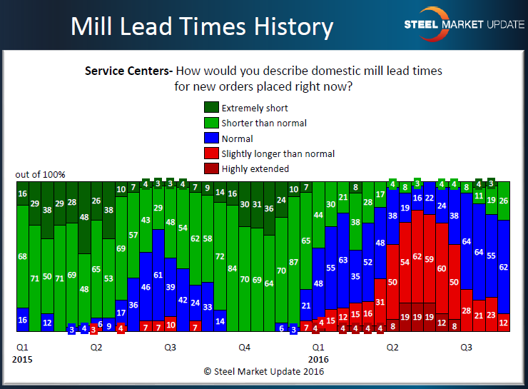The improvement of delivery performance is related to lead times and as lead times shrink the ability to negotiate spot pricing improves. Our Premium level members have access to our Power Point slides as soon as our analysis has been completed at the end of each survey period. We conduct our surveys at the beginning of every month and then again on the 15th of the month. As you can see by the graphic provided below we try to provide details about the market in a historical context so our Premium level members can make the best decisions possible for their company. Lead times are now running at “normal” to “shorter than normal” according to the service centers who participated in last week’s questionnaire.