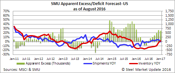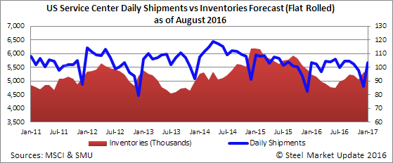In the process what we are seeing (if correct) is for service center inventories to grow and the excessive inventory situation to remain in place into 2017. What would make these numbers change? A boost in shipments would change the tide.