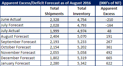 We forecast service center apparent deficit would drop from -210,000 tons to -164,000 tons. With the extra 181,000 tons of receipts our proprietary model shows the distributors as having gone back into an excess inventory situation by +48,000 tons.