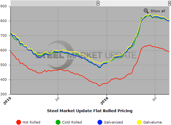 SMU Note: Below is a graphic showing our hot rolled, cold rolled, galvanized, and Galvalume price history. To use the graphs interactive capabilities, you must view it on our website here. If you need help navigating the website or need to know your login information, contact us at info@SteelMarketUpdate.com or by calling 800-432-3475.