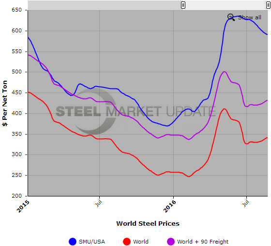 The latest Steel Market Update hot rolled price average is $590 per ton for domestic steel, down $10 per ton compared to the last time we did an update on world prices and down $25 per ton over our late-July price.This puts the theoretical spread between the European HR export price and the SMU HR price at $66 per ton, down from $87 per ton two weeks ago and $105 per ton on month ago. The theoretical spread between the Chinese HR export price and the SMU HR price is $106 per ton, down from $136 per ton two weeks ago and $160 per ton on month ago.