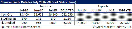 Chinese Iron Ore, Scrap & Flat Rolled Imports/Exports for July 2016