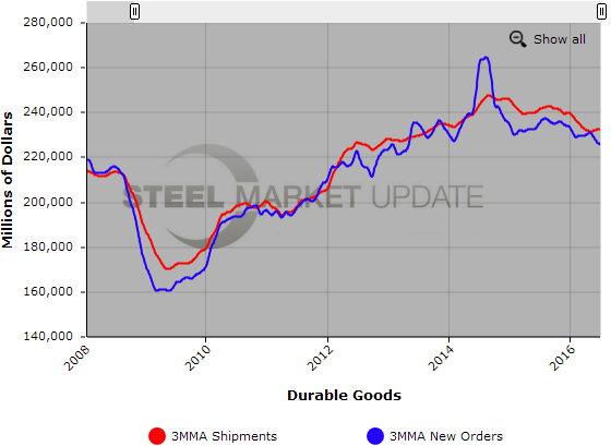 Below is a graph showing the history of durable goods shipments and new orders. You will need to view the graph on our website to use its interactive features, you can do so by clicking here. If you need assistance logging into or navigating the website, please contact our office at 800-432-3475 or info@SteelMarketUpdate.com.