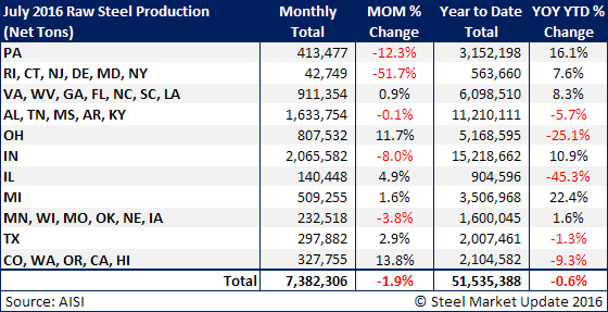 The American Iron & Steel Institute (AISI) recently reported final U.S. raw steel production estimates for the month of July 2016. The monthly estimates are different than the weekly estimates we report in our Tuesday issues; the AISI bases the monthly estimates on over 75 percent of the domestic mills reporting vs. only 50 percent for the weekly estimates.