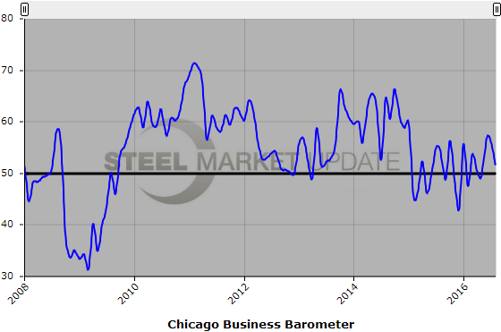 Below is a graph showing the history of the Chicago Business Barometer. You will need to view the graph on our website to use its interactive features, you can do so by clicking here. If you need assistance logging into or navigating the website, please contact our office at 800-432-3475 or info@SteelMarketUpdate.com.