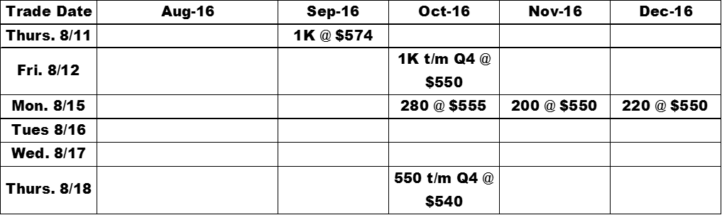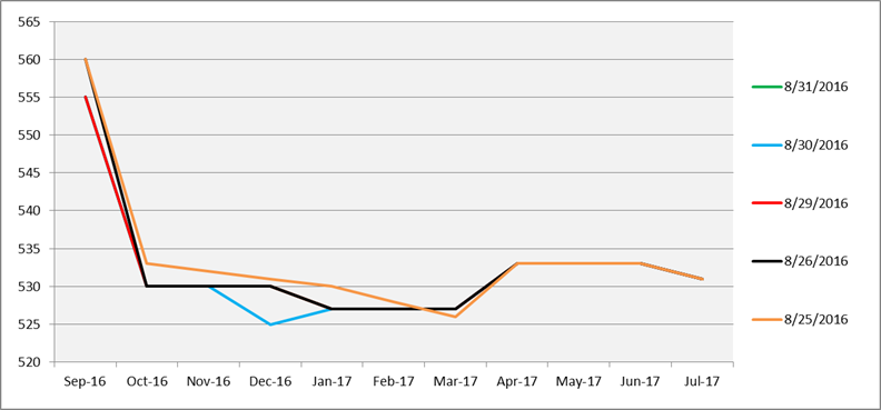 CME Midwest HRC futures limped toward Labor Day with not much trading (excluding one large 5kt/m Q4 trade last Friday) and not much price movement. Excluding September, the curve has flattened around $530/st through December of 2017. 19,160 short tons have traded hands since last Thursday. Open interest is currently at 401,300 st.