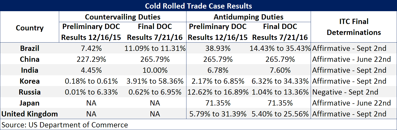 The cases against China and Japan cold rolled were announced separately (June 22, 2016) as both countries did not participate in defending themselves and were found to have injured the U.S. steel industry. A complete look at each country and their projected cash deposit rates is shown at the end of this article.