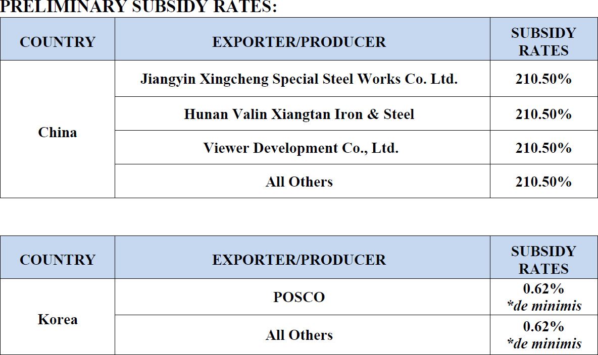 Exporter and producers in the China investigation received subsidy rates of 210.5 percent based on available adverse facts (they did not participate in the DOC review process). A de minimis rate of 0.62 was determined for Korean steelmaker POSCO and all other imports of plate from Korea. A de minimis rate means Korea will not have to pay any cash deposit on CTL plate exported to the United States.