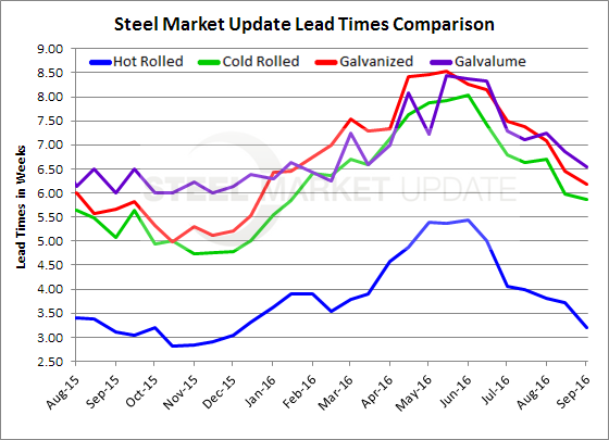 The following information comes from our flat rolled steel market trends survey which began last Friday and concluded earlier today. Do not confuse our survey results with actual lead time sheets produced by individual steel mill locations. Based on what our respondents shared with SMU, lead times on hot rolled, cold rolled, galvanized and Galvalume all shrunk since our last analysis conducted during the middle of August 2016.