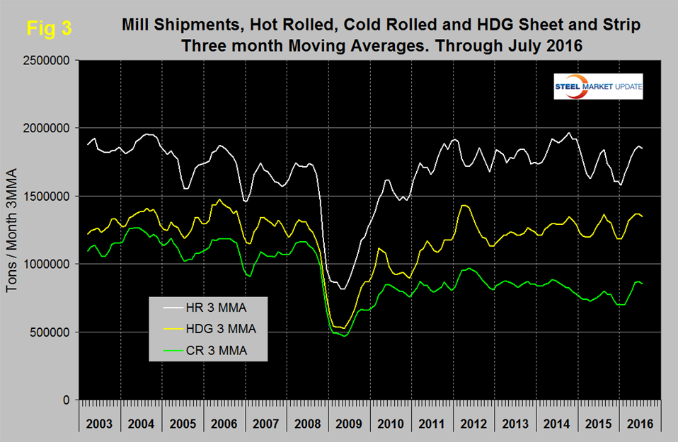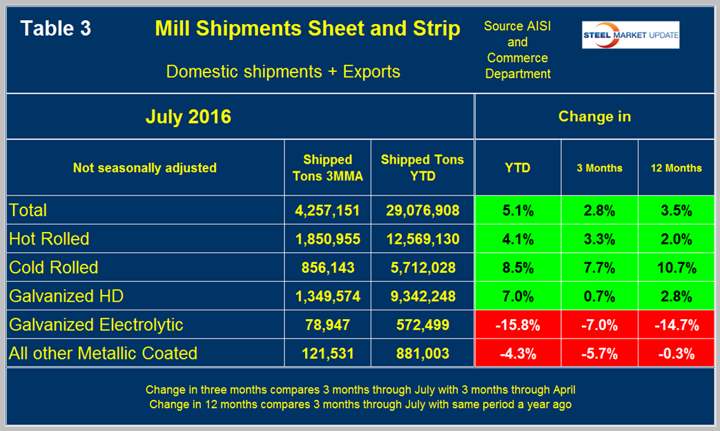 Table 3 shows that total shipments of sheet and strip products including hot rolled, cold rolled and all coated products were up by 3.5 percent in 3 months through July year over year and up by 2.8 percent comparing three months through July with three months through April.