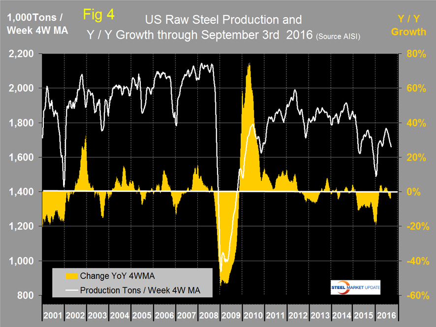 SMU Comment: The numbers in this report illustrate why it’s necessary to look at different time periods to try to understand the whole picture. We could draw different conclusions based on which time period we chose to describe. Shipments and supply of total sheet products are both still experiencing positive Y/Y growth but the growth of shipments may be going into decline as supply growth for HDG and CRC is hesitating. A problem with this data is that it’s now mid-September and the latest data we have for shipments and supply is for July. The AISI puts out weekly data for crude steel production the latest for which was w/e September 3rd. This provides the most current data for steel mill activity. Figure 4 shows the Y/Y change in weekly crude output on a four week moving average basis.