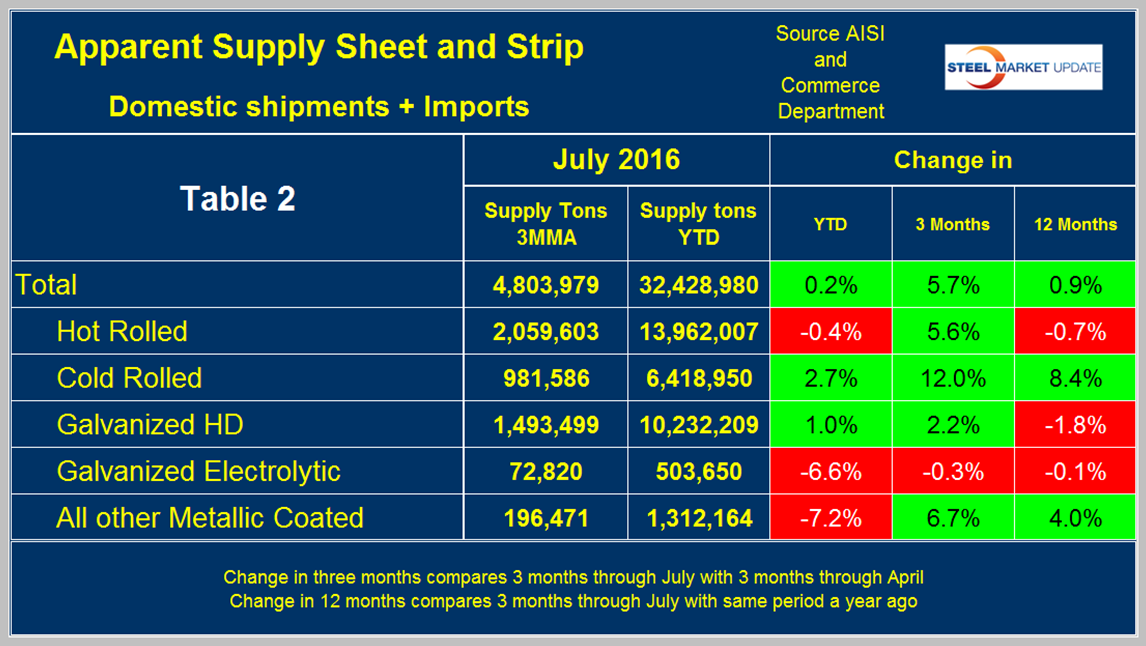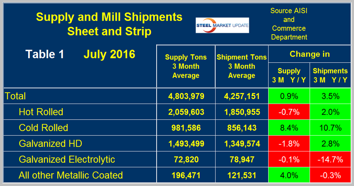 Table 1 shows both apparent supply and mill shipments of sheet products (shipments includes exports) side by side as a three month average through July, for both 2015 and 2016.