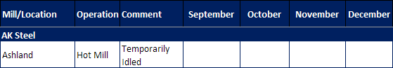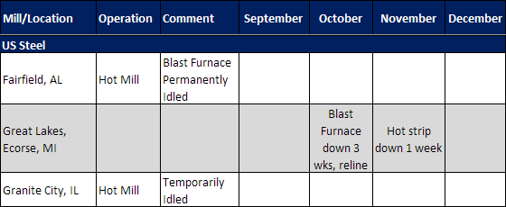 If the mill is not listed below it is because we do not have information regarding any “special” maintenance projects at that particular mill. If you have information/corrections that you would like to share with SMU regarding maintenance/outage schedules please send it to: info@SteelMarketUpdate.com