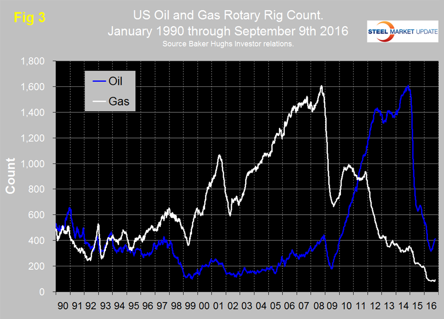 The total number of operating rigs in the US and Canada on September 9th was 639, up from a low of 445 on May 27th. In that time frame the oil rig count was up from 330 to 488 and the gas count was up from 115 to 151. Figure 3 shows the Baker Hughes US Rotary Rig Counts for oil and gas equipment in the US through September 9th (explanation below).