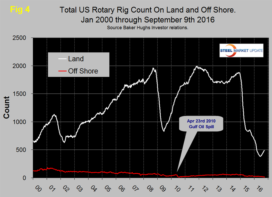 The uptick in the US oil rig count was the first since August of last year and now seems to be well established having increased from 316 on May 27th to 414 on September 9th. Based on the most recent available data, the EIA estimates that oil production from hydraulically fractured wells now makes up about half of total U.S. crude oil production. The off shore US rig count peaked at 66 on August 29th 2014 immediately before the oil price crash. Since then the off shore count has steadily declined to 18 (Figure 4).