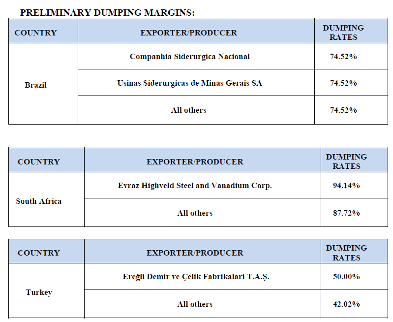 Critical circumstances were found by Commerce to exist for all exporters from Brazil and Turkey. Duties for these two countries will be retroactive effective 90 days prior to the Sept. 7, 2016 decision by Commerce.