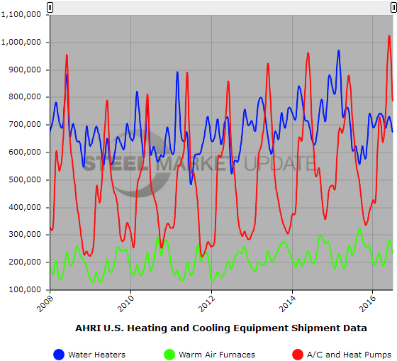 Below is a graph showing the history of water heater, warm air furnace, and air conditioner shipments. You will need to view the graph on our website to use it’s interactive features, you can do so by clicking here. If you need assistance with either logging in or navigating the website, please contact our office at 800-432-3475 or info@SteelMarketUpdate.com.