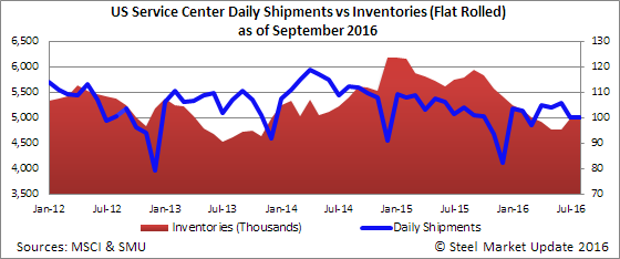 Service centers shipped 100,000 tons per day of flat rolled during the month of August which is the same as what was shown for the month of July and is also lower than all of the other months so far this year with the exception of March (96,900 tons per day).