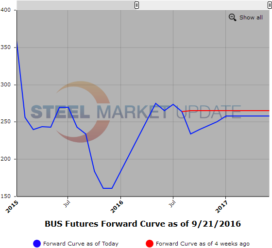 Lower HR prices are impacting BUS price expectations here this week. In the near dates BUS buyers have retreated with Q4’16 last trading last week at $245/GT. Offers remain at $250/ GT for the period in small size. Market sentiment in BUS is a bit bearish but no firm indication on where October will come in yet. Maybe flat to slightly lower. Adding to the bearish sentiment in scrap is that CFR Turkish exports have been slowing down and prices have been declining slightly, down $6 since Monday.