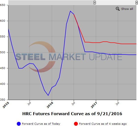 The focus in HR this past week has been primarily in Q4’16 and 1H’17. Futures prices have dropped to the psychological $500 level and just below for this futures range. We are seeing more interested buyers down at these sub $500 levels however the notional amounts have shrunk as participants behave more cautiously. The levels also represent about a 50% retracement of the price increase from the mid $300 dollar level to the $640 level. The forward discount for this period is running just over $30/ST based on the last reported index release.