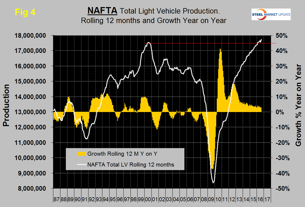 On this basis production has been at an all-time high every month in 2016. On a rolling 12 months basis y/y the US was up by 2.9 percent with negative momentum, Canada was up by 6.0 percent with negative momentum and Mexico was up by 1.6 percent with very positive momentum (Table 1).