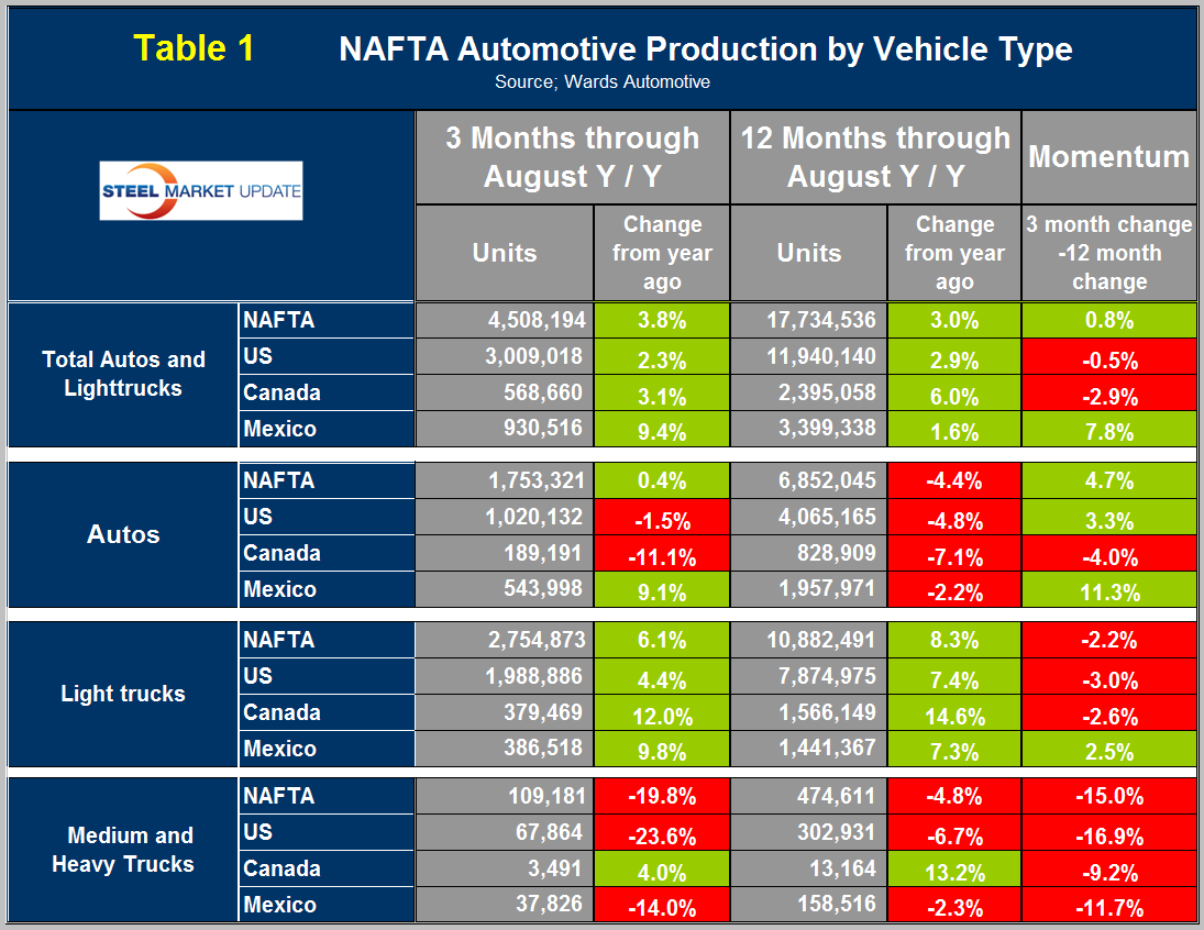 On a rolling 12 months basis y/y through August, LV production in NAFTA increased by 3.0 percent which was up from 2.4 percent in 12 months through July and is still consistent with the growth experienced in the last 12 months as indicated by the brown bars in Figure 4.
