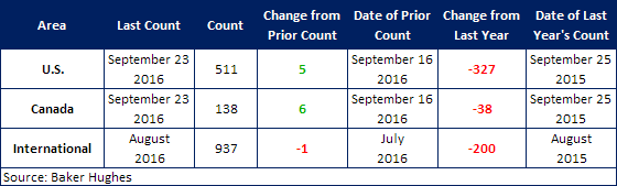 According to Baker Hughes data from September 23, 2016, the U.S rig count for the week was 511 rigs exploring for or developing oil or natural gas. This is up 5 rigs compared to last week, with oil rigs up 2 to 418 rigs, gas rigs up 3 to 92 rigs, and miscellaneous rigs unchanged at 1 rig. Compared to this time last year, the 511 count is down 327 rigs, with oil rigs down 223, gas rigs down 105, and miscellaneous rigs up 1.