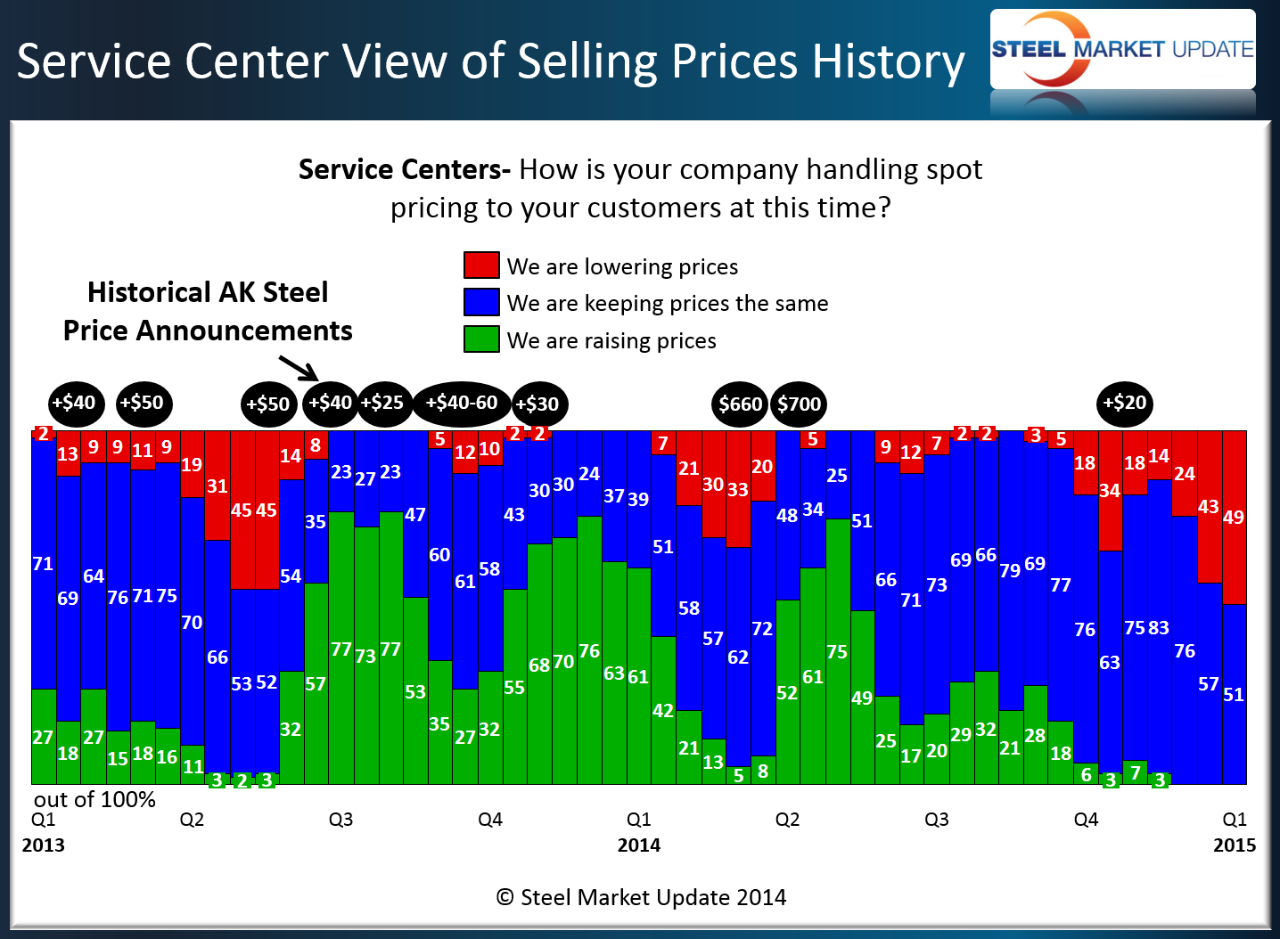 If you look at the Power Point presentation on our website, in the 29th slide we address the service center view of spot prices history with the AK Steel price increase announcements referenced above the red bars. Going back to January 1, 2015, the price increase announcements came approximately two months to three months from when the peak of capitulation occurred. We have not yet reached the 75 percent level but we are very close and I expect that we will if domestic steel prices (mill spot prices) continue to drift lower in the coming weeks.