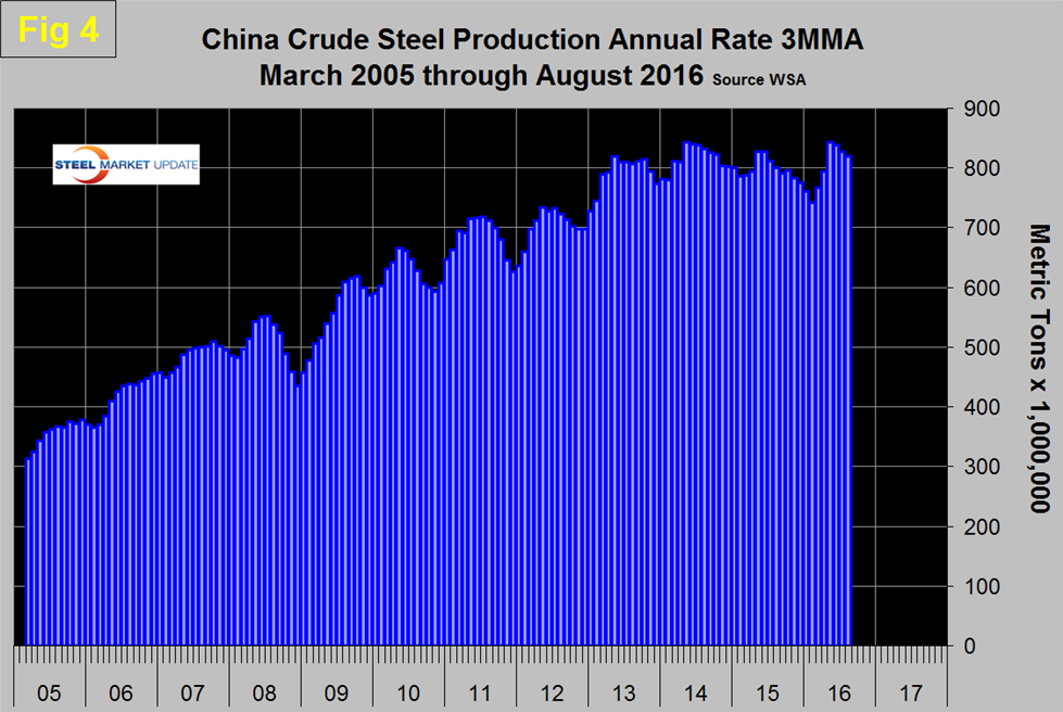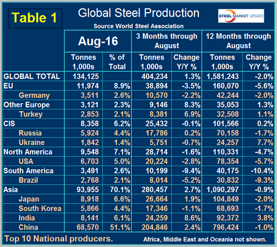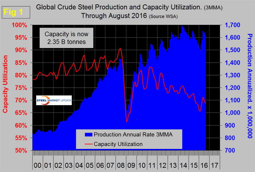 SMU Comment: Evidently China is picking up the pace again as the rest of the world has contracted for 18 straight months through July and experienced a slight positive 0.1 percent growth in August. With a global capacity utilization of less than 69 percent in July and August it is evident that capacity reductions have a long way to go before they begin to reduce the market pressure of over production. According to the OECD, capacity will continue to increase through 2018. To make matters worse, global economic growth is slowing as we will report next month when the new report and forecast of global GDP will be released by the IMF. We repeat what we have said before and still believe, that oversupply and low capacity utilization won’t be resolved before the end of this decade and probably well into the next.