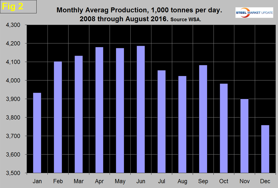 As we dig deeper into what is going on, we start with seasonality. Global production has peaked in the summer for the last seven years including 2016. Figure 2 shows the average monthly production by month since 2008.