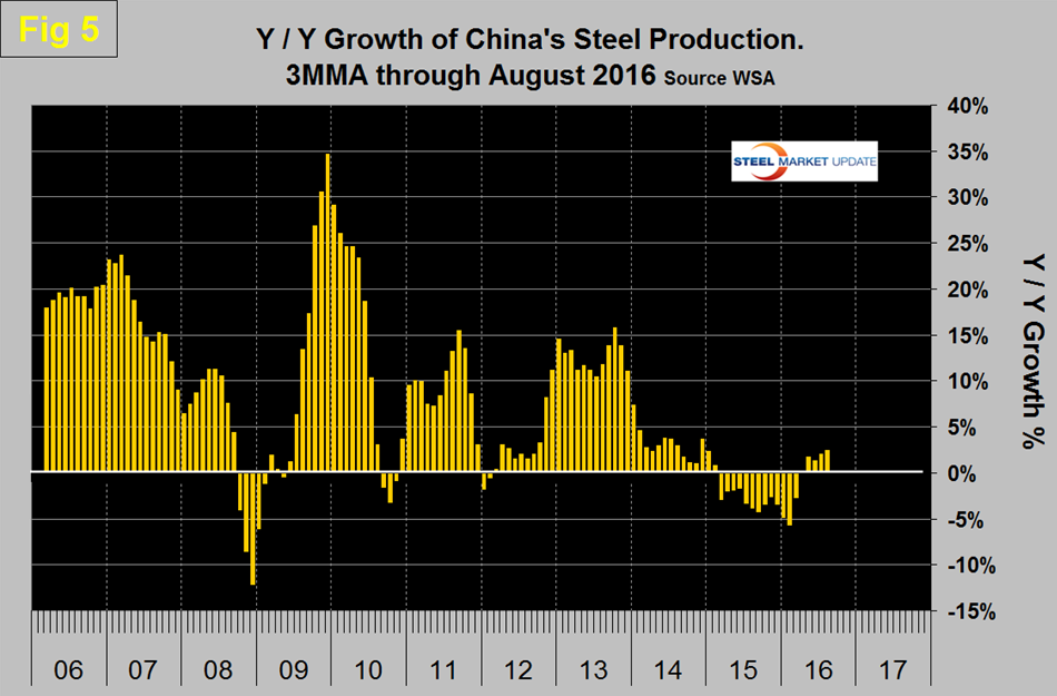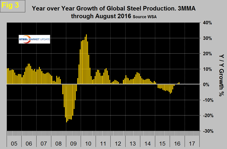 Production began to contract in March last year and the contraction accelerated through January this year when it reached 5.8 percent. In the next four months contraction slowed and in May was zero. June, July and August have had year over year increases in the 3MMA of 0.1 percent, 0.7 percent and 1.3 percent. The much desired slowdown in global steel production has reversed course on a year over year basis and China has been the driver.