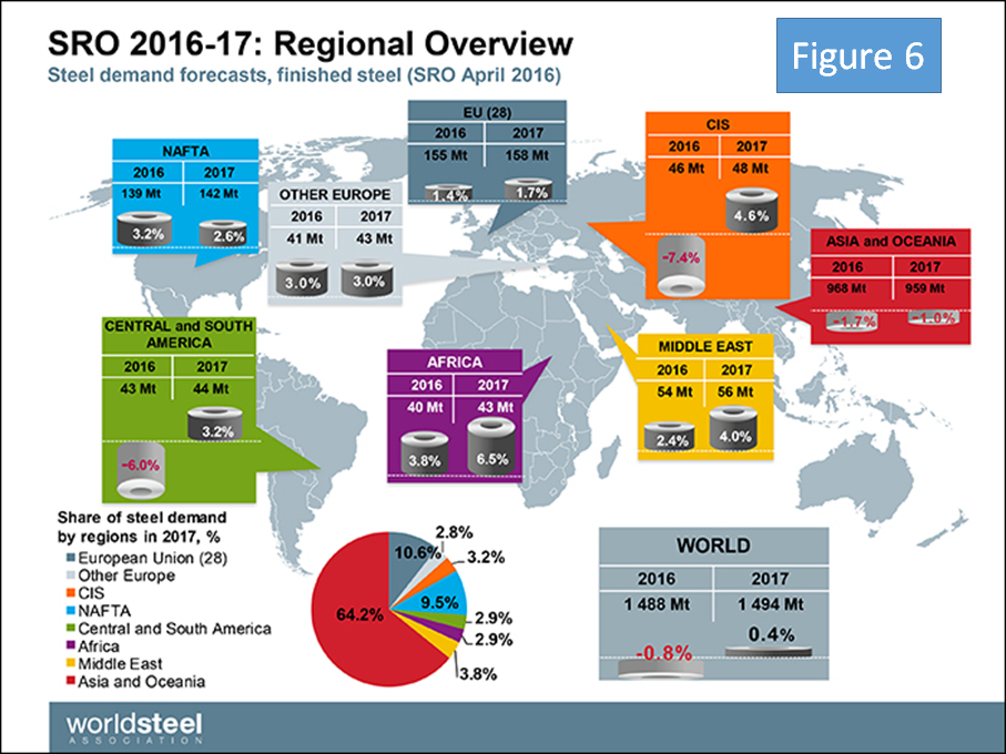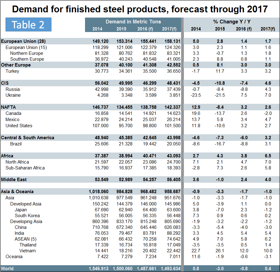 The October 2015 version of the World Steel Association Short Range Outlook (SRO) for apparent steel consumption in 2015 and 2016 had last year contracting at 1.7 percent and 2016 growing at 0.7 percent. What actually happened was that consumption contracted by 3.2 percent in 2015. In April this year the WSA updated its forecast. (Note this forecast is steel consumption, not crude steel production which is the main thrust of what you are reading now.) Figure 6 is a geographical view of production and growth in 2016 followed by Table 2 which shows the expectations by country and region.