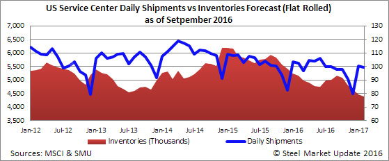 Last month we based our U.S. flat rolled steel service center shipments and inventories on a relatively conservative model. Our belief at that time was both shipments and inventory receipts would be 3 percent below the 3 year average. In actuality shipments were -3.7 percent below year-over-year levels but 7.2 percent below the 3 year average. Carbon flat rolled inventory receipts came in 3.3 percent below year ago levels and 9.0 percent below the 3 year average.