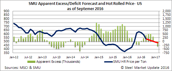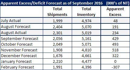 Shipments during the month of September would come in at 2,055,700 tons and inventories would grow to 5,161,500 tons. The Apparent Excess would grow to +429,000 tons from the current level of +234,000 tons. Here is what the forecast would look like over the next few months based on the 3 percent lower than year ago level forecast for both shipments and receipts.