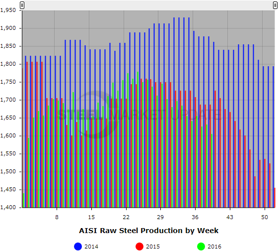 SMU Note: Below is a graphic showing the weekly raw steel production history. To use the graphs interactive capabilities, you must view it on our website. You can do this by clicking here. If you need help navigating the website or need to know your login information, contact us at info@SteelMarketUpdate.com or by calling 800-432-3475.
