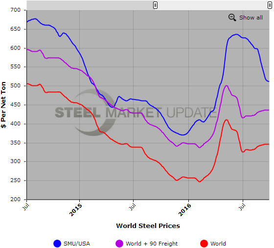 Therefore, the theoretical spread between the SteelBenchmarker world HR export price and the SMU HR price is $74 per ton ($164 prior to import costs), meaning foreign steel imported into the US is theoretically $74 per ton cheaper than domestic steel. This spread is down $15 from our previous analysis and down $85 from mid-August.