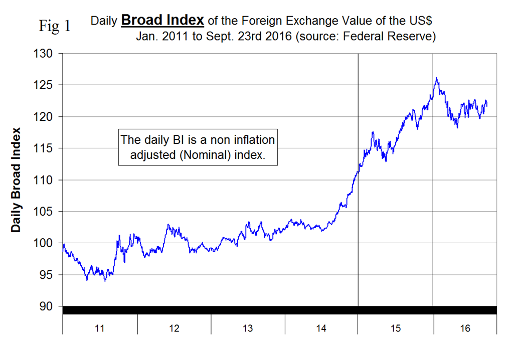 Please see the end of this report for an explanation of data sources. The Broad Index value of the US $ is reported several days in arrears, the latest value we have was dated September 23rd (Figure 1).