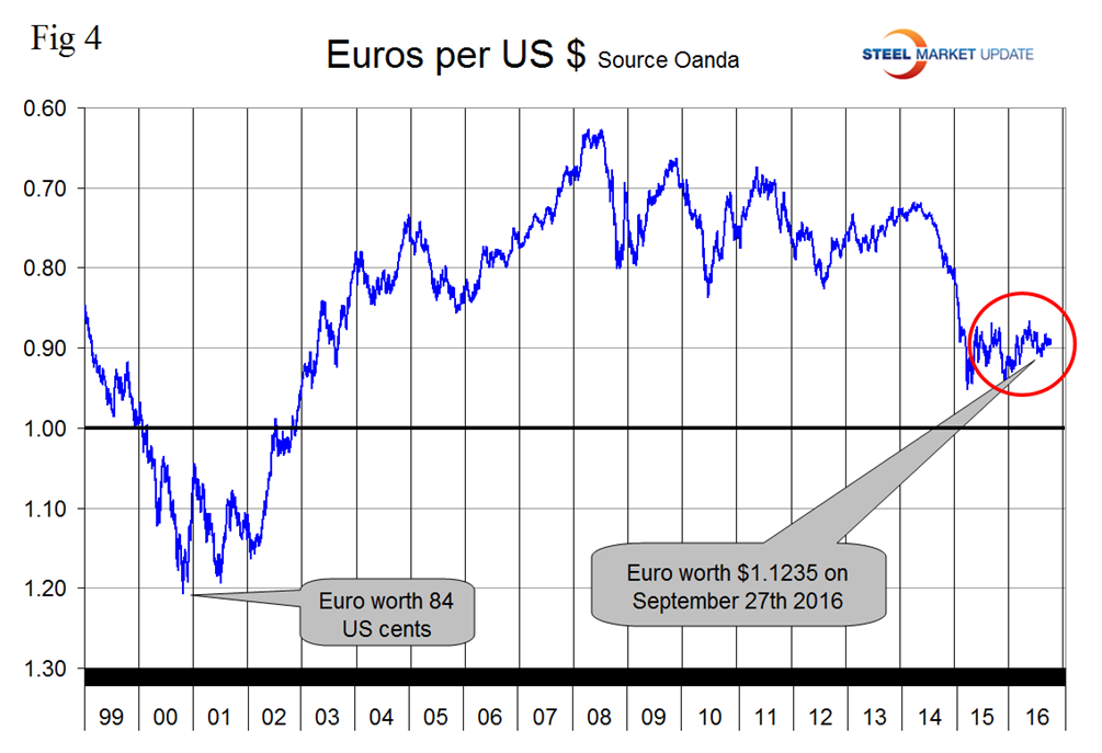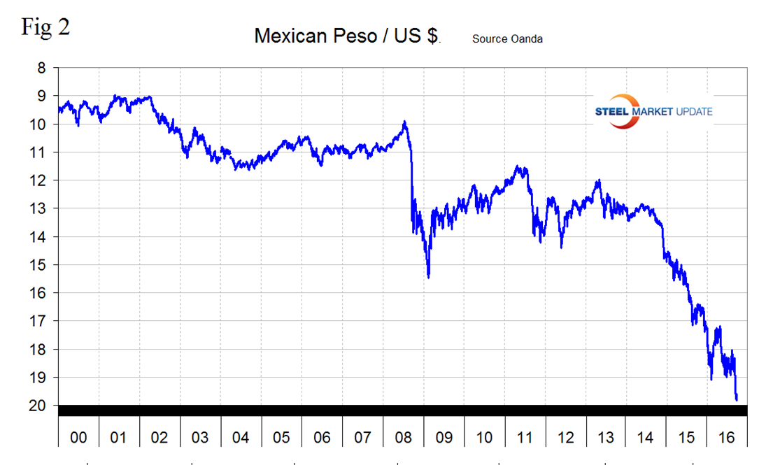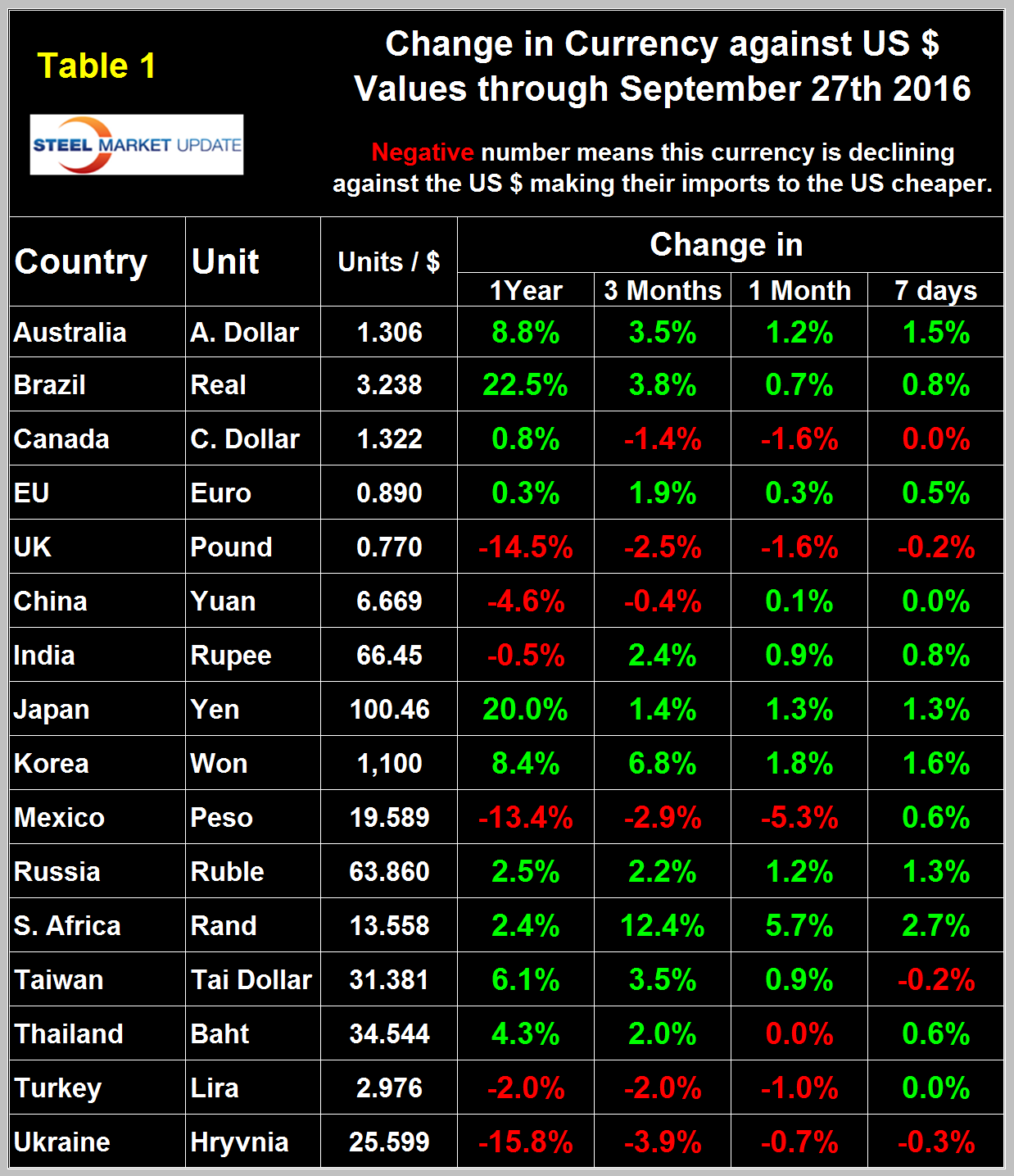 In each of these reports we comment on a few of the 16 steel trading currencies listed in Table 1. Charts for each of the 16 currencies listed in Table 1 are available through September 27th for any subscriber who requests them.