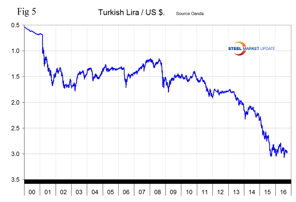 The Turkish Lira took a dive on news of the coup attempt to an all-time low of 3.076/US $ on July 21st but has since recovered to 2.976 however this represents a decline of 1.0 percent in the last month and once again is flirting with the 3.0 to the dollar level (Figure 5).