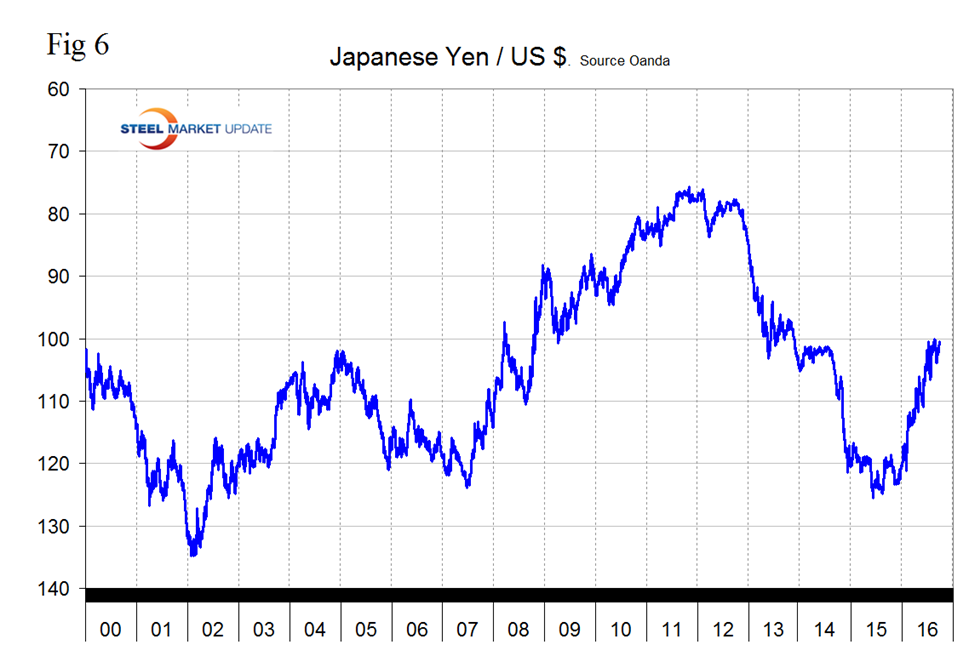 An estimated 25 percent of the U.S. economy has some involvement in international trade therefore currency swings can have a large effects on the economy in general and of the steel industry in particular. At the one month level and since our last report on August 26th the dollar has weakened against ten of the sixteen and strengthened against the others. At the seven day level shown in Table 1 the dollar has weakened against 12 of the 16 as the Fed elected not to move.