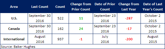 According to Baker Hughes data from September 30, 2016, the U.S rig count for the week was 522 rigs exploring for or developing oil or natural gas. This is up 11 rigs compared to last week, with oil rigs up 7 to 425 rigs, gas rigs up 4 to 96 rigs, and miscellaneous rigs unchanged at 1 rig. Compared to this time last year, the 522 count is down 287 rigs, with oil rigs down 189, gas rigs down 99, and miscellaneous rigs up 1.