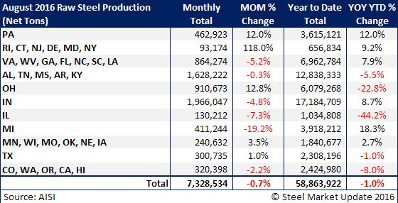 The American Iron & Steel Institute (AISI) recently reported final U.S. raw steel production estimates for the month of August 2016. The monthly estimates are different than the weekly estimates we report in our Tuesday issues; the AISI bases the monthly estimates on over 75 percent of the domestic mills reporting vs. only 50 percent for the weekly estimates.