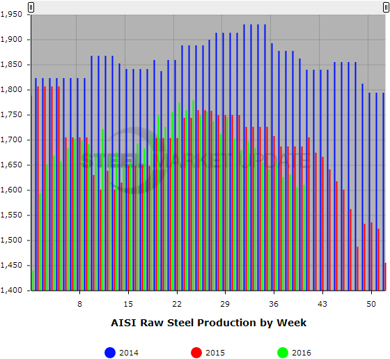 SMU Note: Below is a graphic showing the weekly raw steel production history. To use the graphs interactive capabilities, you must view it on our website. You can do this by clicking here. If you need help navigating the website or need to know your login information, contact us at info@SteelMarketUpdate.com or by calling 800-432-3475.