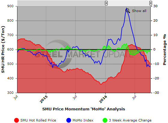 The Steel Market Update (SMU) Price Momentum Index (MoMo) for hot rolled steel in the United States remained negative this week for the 12th consecutive week, following a 28 week long positive streak. MoMo is a trailing indicator and shows the relationship between the current U.S. hot rolled coil price movements against the previous 12-week average price as a percentage. A positive MoMo index indicates hot rolled steel prices are moving in an upward direction compared to the previous 12 week period, while a negative index number indicates a downward direction in prices.