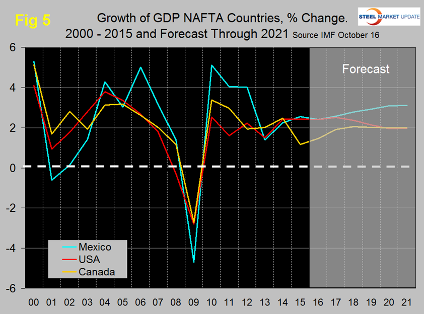 Within NAFTA, the growth of GDP of all three nations coincided in 2014. Mexico and the US will track each other through 2017 then Mexico will pull away as the US growth declines. Canada performed relatively badly in 2015 and is expected to catch up with the US in 2019 through 2021 (Figure 5).