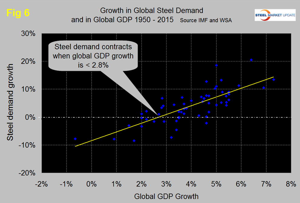 There is a relationship between the growth of GDP and steel demand at both the international and national level which also extends to other commodities such as cement. There are two interesting aspects to this relationship. First, the cyclical change in steel demand is vastly more volatile than the change in GDP which we attribute to the inventory response throughout the supply chain. Secondly, as discovered by our friends at “Steel Guru,” 1 percent growth in GDP does not result in 1 percent growth in steel demand. At the global level it takes a 2.8 percent increase in GDP to get any increase in steel demand (Figure 6).