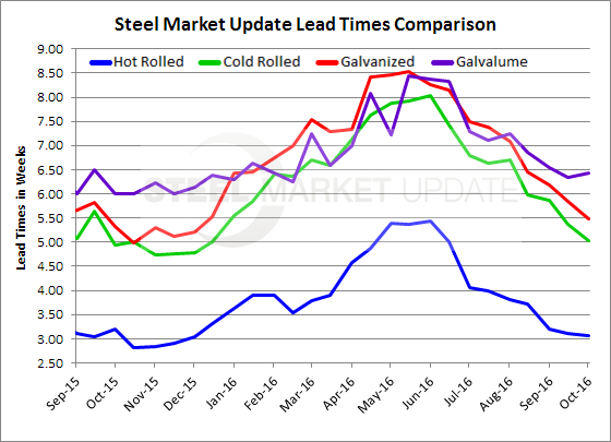 Cold rolled lead times are averaging 5 weeks (5.04 weeks) which is essentially the same as what was being reported one year ago (4.95 weeks). The new average is slightly shorter than what we reported two weeks ago (5.38 weeks) and is much lower than what we saw in mid-August/early September of approximately 6 weeks (5.87 & 5.97 weeks).