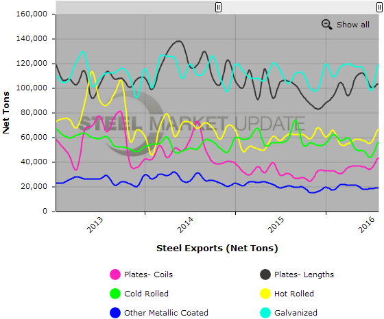 To use the interactive features of the Steel Exports history graphic below, you must do so on our website here. If you need any assistance logging in or navigating the website, contact us at info@SteelMarketUpdate.com or 800-432-3475.