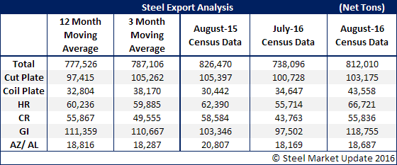 August steel exports totaled 812,010 net tons (736,644 metric tons), up 10.0 percent over July but down 1.7 percent from August 2015. This is the highest export level seen since August 2015, while last month we saw exports at a 7 month low (738,096 tons). Total August figures are above the thee month moving average (average of June, July, and August 2016 figures) and above the twelve month moving average (average of September 2015 through August 2016 data). Here is a breakdown of flat rolled and plate exports: